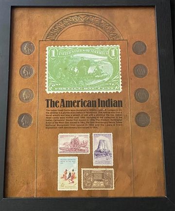 Vintage Framed Indian Head Penny coins 1894-1905 (8) & stamps (4)