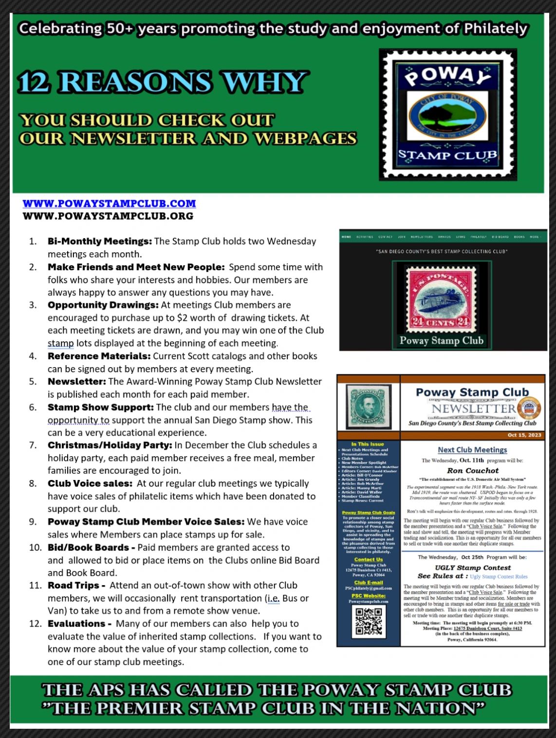 We would like to hear from you. Whether you have a question about a stamp, a cover, a collection or accumulation you inherited/acquired, our lecture series, and/or becoming a member – please send an email to our Secretary, with the reason in the Subject line to PSCPhilately@gmail.com. He will get back to you as soon as he can. Thank you for visiting the Poway Stamp Club website.